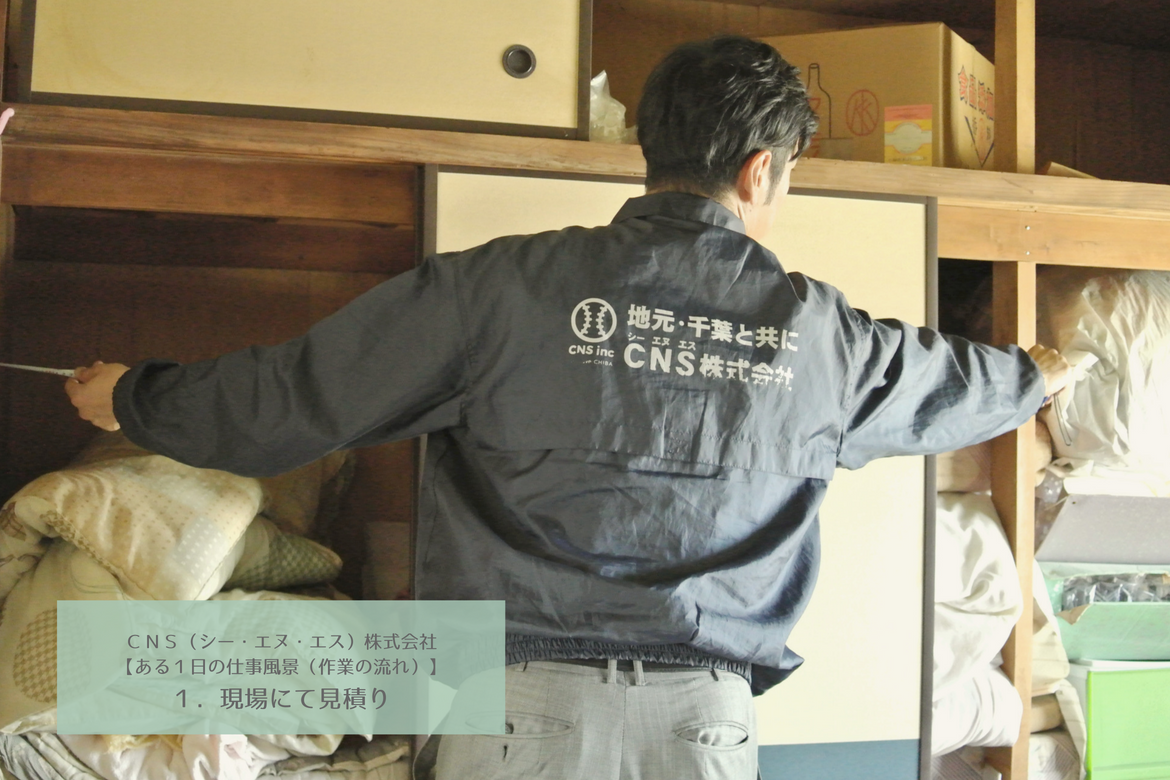 遺品整理・空き家管理にはじまるCNS(シー・エヌ・エス)株式会社の作業の流れを、ご紹介いたします。お見積りから、準備・点検。現場の作業と、倉庫管理まで丁寧に実施しております